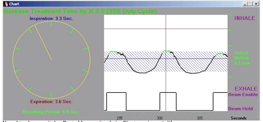 Typisches Beispiel für eine besondere Schonung innerer Organe durch die atemgesteuerte Bestrahlung ist die Behandlung von Brustkrebs. Gerade bei Patientinnen mit linksseitigem Brustkrebs ist die Nachbestrahlung mit dem potentiellen Risiko einer Belastung des Herzens verbunden. Dies liegt daran, dass bei einigen Frauen das Herz in die Nähe des Behandlungsbereiches kommen kann und durch die applizierte Dosis nach Jahren ein erhöhtes Risiko einer Herzgefäßerkrankung besteht. Dieses Risiko kann durch die atemgestützte Bestrahlung vermieden werden. Möglich wird dies, indem die Therapieplanung und die Durchführung jeder Behandlung in der tiefen Einatmungsphase durchgeführt werden. Durch das tiefe Einatmen weitet sich der Brustkorb, die Lungen drücken das Herz zusammen und verschlanken dieses. Dadurch kann eine Behandlung an der Brust gegeben werden, ohne dass der Therapiestrahl in die Nähe des Herzens kommt. Praktisch durchgeführt wird dies, indem wir mit den Patientinnen ein entsprechendes Atemtraining durchführen und über einen Monitor genau die Tiefe der Einatmung der Patientinnen darstellen können. Dieser Monitor ist für die Patientin während der Therapie sichtbar, sodass immer die gleiche Tiefe der Einatmung erreicht werden kann.