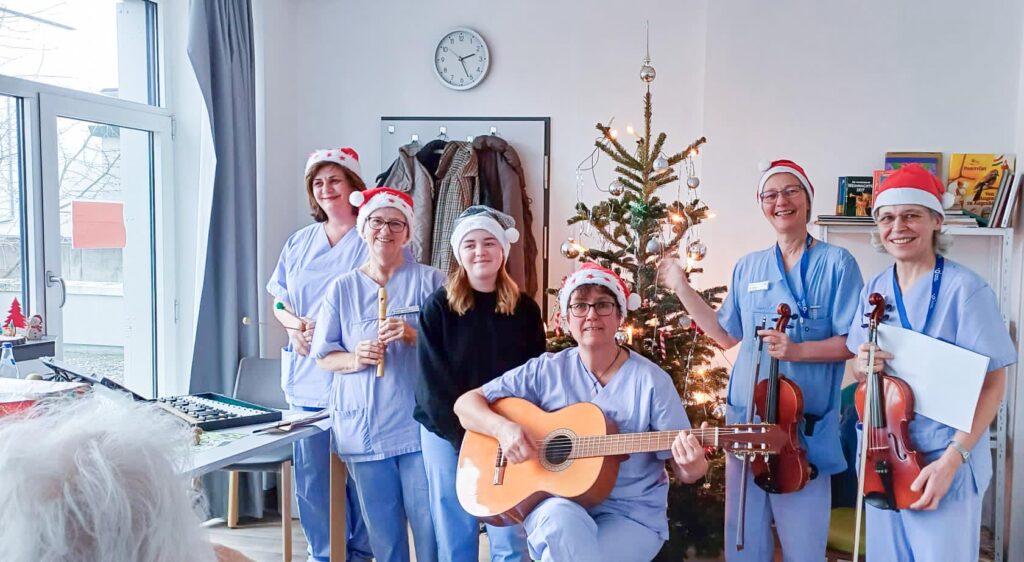 Diese Woche hat das Team der Akutgeriatrischen Tagesklinik eine Weihnachtsfeier für die Patient*innen veranstaltet. Mit Geschichten, Gedichten und einem Ratespiel haben die Mitarbeiterinnen den Senior*innen einen abwechslungsreichen Nachmittag bereitet. Besonders viel Freude hatten die Patient*innen beim gemeinsamen Singen, welches von einer Mitarbeitercombo bestehend aus Xylophon, Blockflöte, Gitarre und zwei Geigen begleitet wurde.