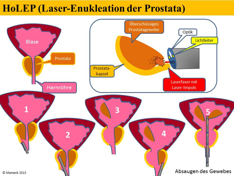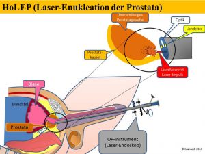 Zur möglichst schonenden und blutungsarmen Abtragung von überschüssigem Prostatagewebe steht neben der transurethralen Resektion die Laserenukleation mit dem „Holmium-Laser” zur Verfügung. Die Behandlung der Laser-Enukleation der Prostata (HoLEP und ThuLEP) besteht aus zwei operativen Schritten. Zunächst wird mit dem Holmium-Laser eine sogenannte Enukleation vorgenommen. Dabei wird das überschüssige Gewebe zunächst ausgeschält (enukleiert). Es wird also – ähnlich wie bei der TUR-P – das gutartige Prostatagewebe vollständig abgetragen.