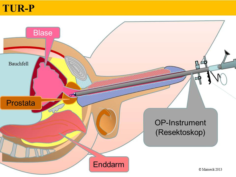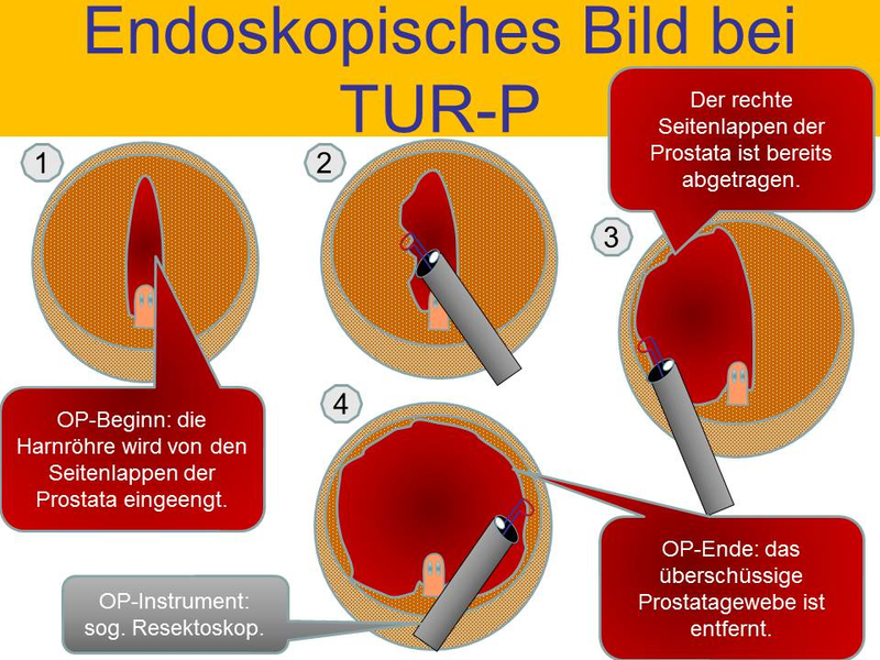 Scheitern medikamentöse Behandlungen, sind operative Maßnahmen notwendig, um wieder eine einwandfreie Harnblasenentleerung zu erreichen. Allein in Deutschland unterziehen sich über 60.000 Männer jährlich einer Operation wegen einer gutartigen Prostatavergrößerung. Dabei wird je nach Größe der Prostata eine Operation meist über die Harnröhre (transurethral) durchgeführt. Die transurethrale Resektion der Prostata (TUR-P) stellt das Gold-Standardverfahren dar: Das heißt, die TUR-P ist die am genauesten untersuchte Operationsmethode bei gutartiger Prostatavergrößerung mit den besten Langzeitergebnissen.