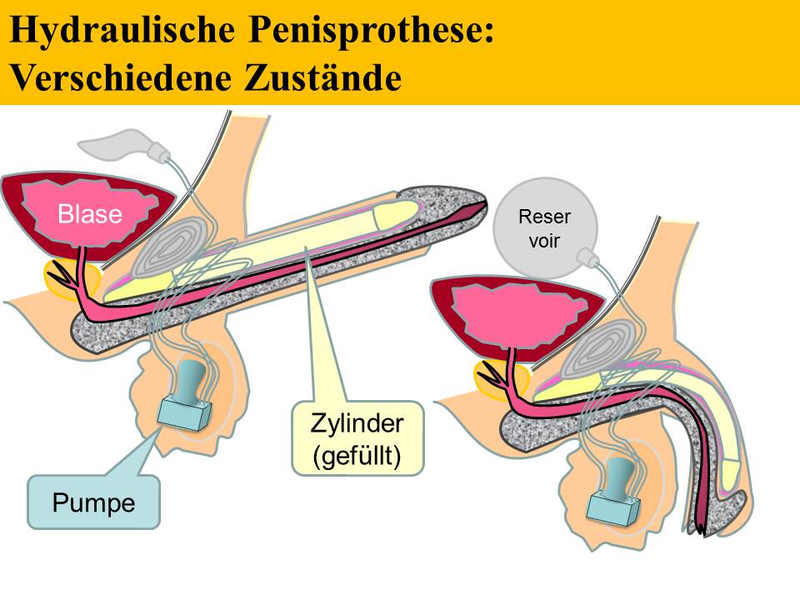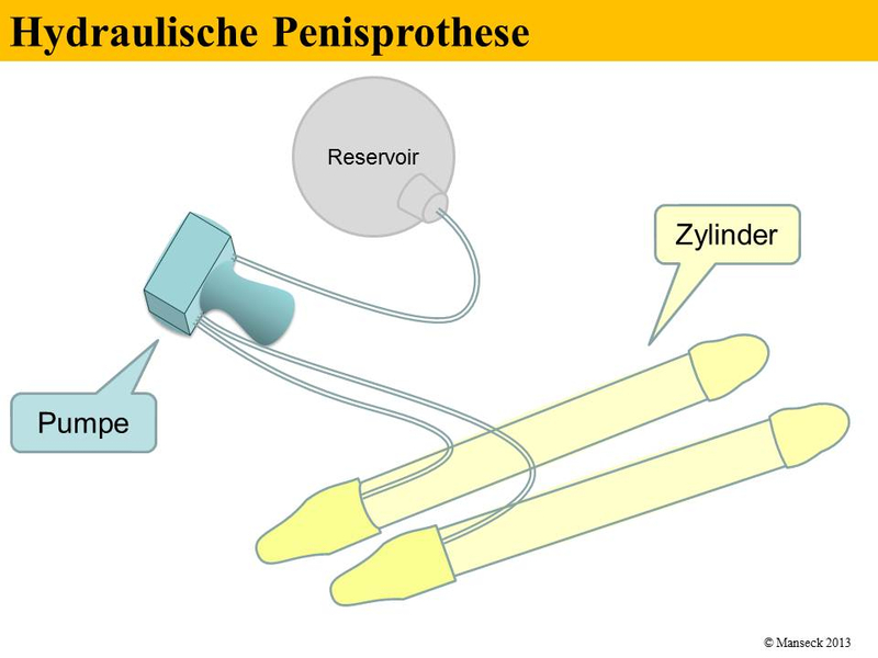 Eine hydraulische Penisprothese beteht aus drei Komponenten: zwei Zylinder (je eine für jeden Schwellkörper), eine Pumpe und ein Flüssigkeits-Reservoir (mit dem die Zylinder befüllt werden können). Die Zylinder werden in die Schwellkörper des Patienten eingesetzt. Diese Zylinder können mit Hilfe der Pumpe gefüllt und wieder entleert werden, so dass Erektion und Entspannung möglich sind. Während die Pumpe gut zugänglich im Hodensack eingesetzt ist, liegt das Flüssigkeitsreservoir unsichtbar in der Bauchhöhle.