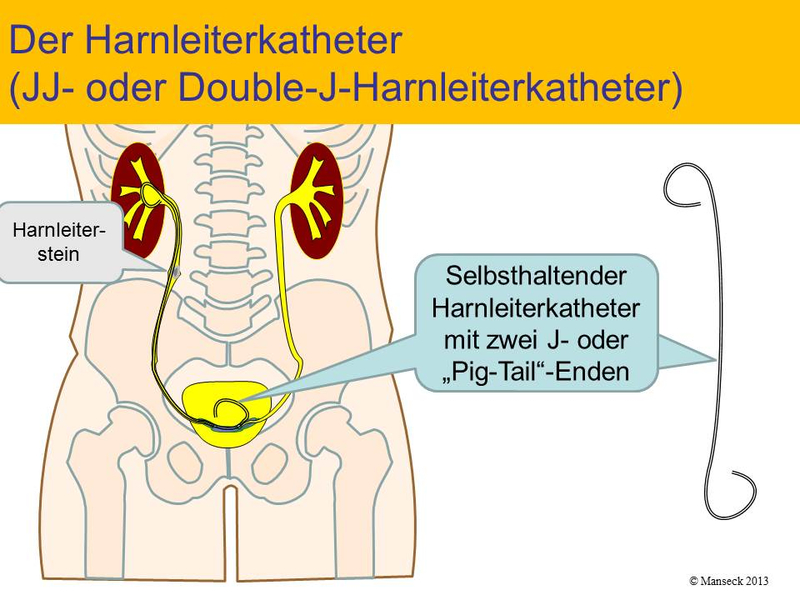Wegen der Verschwellung des Harnleiters und seiner Mündungsregion wird abschließend häufig ein Harnleiterkatheter eingelegt. Dieser wegen seiner Form als JJ-Katheter oder oft auch Double-J bezeichnete Katheter muß nach einiger Zeit wieder entfernt werden. Hinzu kommt bedarfsweise ein Harnröhrenkatheter, z. B. bei gestörter Blasenentleerung.