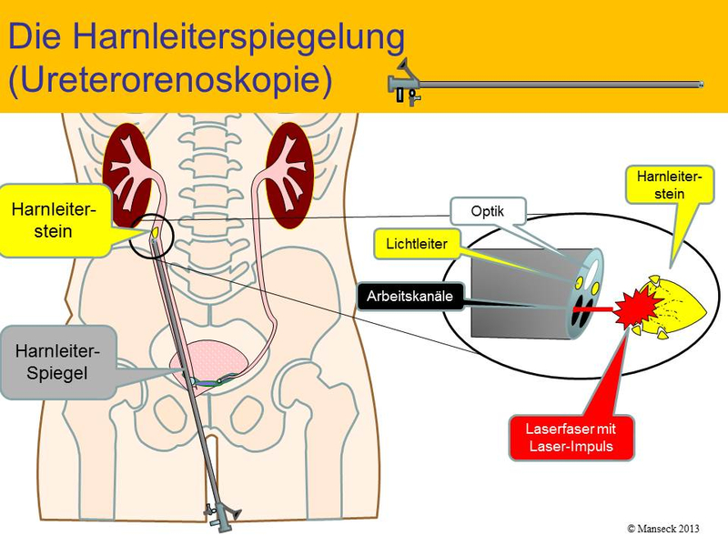 Ein optisches Spezialinstrument (starr oder flexibel) mit einem Durchmesser von 2 bis 4 mm (je nach Größe des Arbeitskanals) wird unter Sichtkontrolle durch die Harnröhre und Blase in den Harnleiter eingeführt und hochgeschoben. Bei Bedarf muss die Harnleitermündung aufgedehnt werden. Das Vorgehen wird oft durch eine Röntgenuntersuchung kontrolliert. Diese ist auf den neu verfügbaren und besonders strahlensparenden urologischen Röntgenarbeitsplätzen (Siemens Uroskop Omnia) besonders wenig belastend. Hier verfügt der Operateur während des Eingriffs über alle wichtigen Bildinformationen des Patienten. Diese im hauseigenen RIS/PACS System gespeicherten Bilder und Befunde können über Monitore jederzeit abgerufen werden. So ist z. B. die gleichzeitige Darstellung von Röntgen- und Ultraschallabbildungen neben dem digitalen endoskopischen Bild mit einer erheblichen Qualitätsverbesserung für den Patienten möglich.