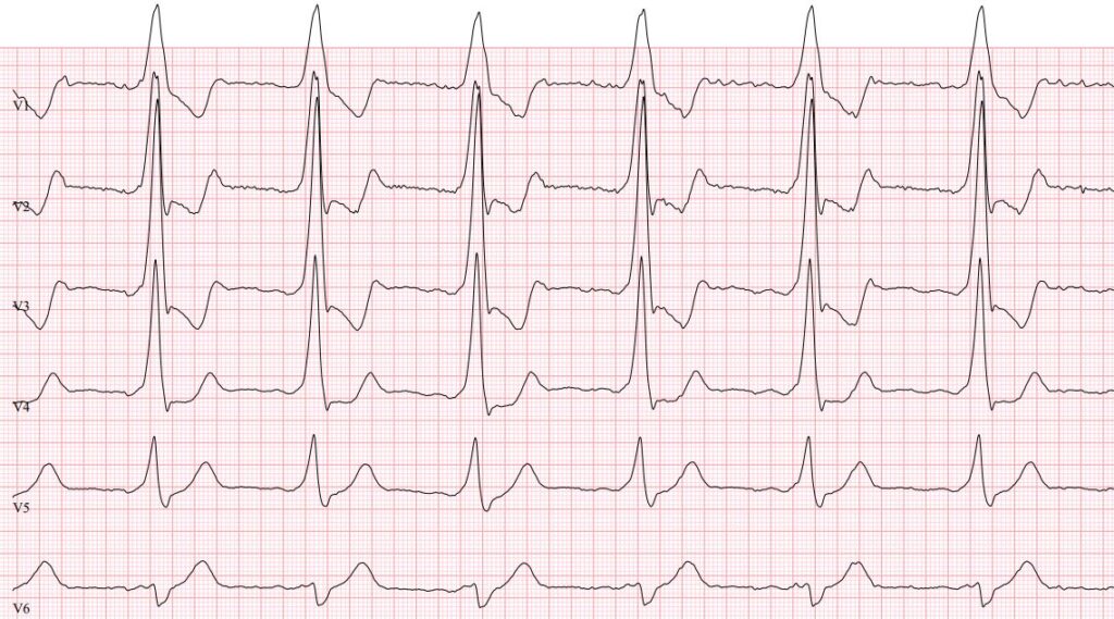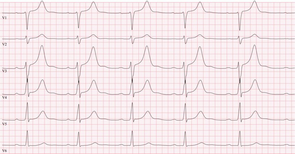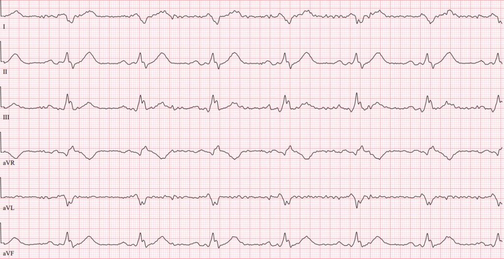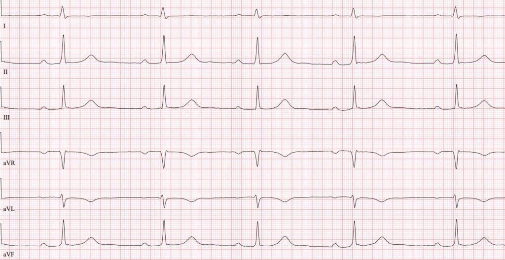 Das Bild illustriert das Elektrokardiogramm eines Patienten mit einer bestimmten Erkrankung (a) sowie das Kontroll-EKG bei gleichem Patienten nach erfolgreicher elektrophysiologischer Behandlung (b).