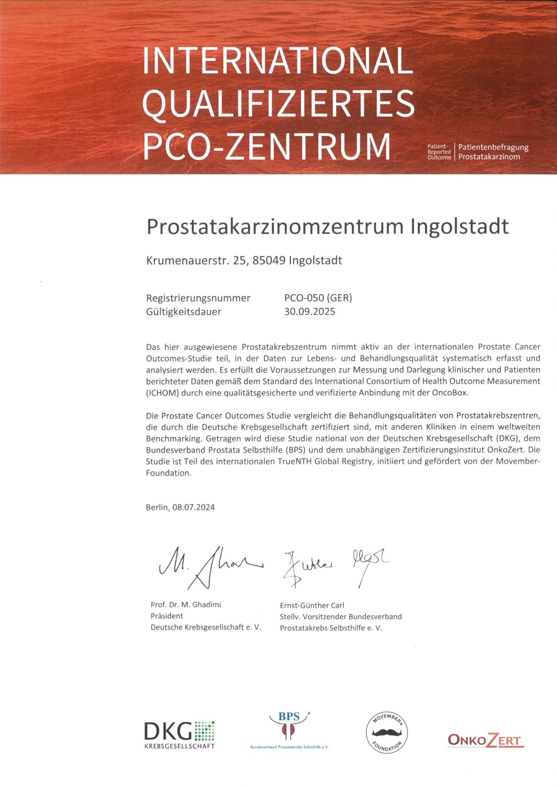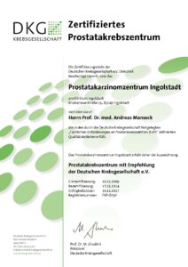 Das ProstatakarzinomZentrum Ingolstadt gehört zu den ersten sechs bayerischen Krankenhäusern, die sich zertifiziertes ProstatakarzinomZentrum nennen dürfen. In aufwändigen Verfahren wurde von unabhängigen Zertifizierungsstellen (OnkoZert) festgestellt, dass alle fachlichen und medizinischen Abläufe von äußerst hoher Qualität sind. Dem ProstatakarzinomZentrum Ingolstadt wurde deshalb die Auszeichnung “ProstatakarzinomZentrum mit Empfehlung der Deutschen Krebsgesellschaft” verliehen. Diese Auszeichnung wird nur Zentren zuteil, die “eine ganzheitliche Versorgung von Patienten durch ein Netzwerk von Spezialisten unterschiedlicher medizinischer und pflegerischer Fachrichtungen ermöglichen, in denen die Fachrichtungen ihre Arbeitsweise gegenseitig auf die Bedürfnisse einer optimalen Patientenversorgung ausrichten.”