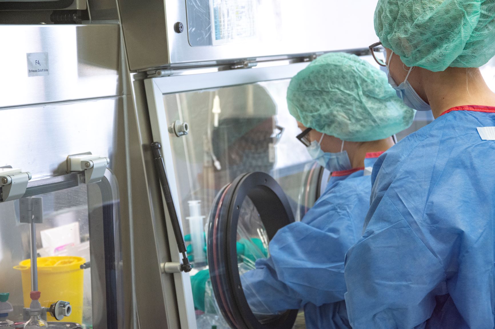Eine Mitarbeiterin mit Mundschutz, blauer Schutzbekleidung und grünen Handschuhen sitzt konzentriert an einer Plexiglasscheibe. In der Scheibe sind zwei Löcher, durch die die Mitarbeiterin mittels befestigter Handschuhe ins Innere des Gehäuses fassen kann. Dort stehen größere und kleinere Fläschchen mit Flüssigkeiten. Manche sind farblos, andere milchig und wieder andere leuchtend rot. Sie zieht ganz langsam eine Einmalspritze mit einer der Flüssigkeiten auf und überträgt diese in einen Infusionsbeutel. Auch das macht sie mit größter Sorgfalt — die ist wichtig, denn hier, im Zyto-Labor, muss alles aufs Milligramm genau stimmen. Hier, versteckt im Keller des Klinikums, werden Lösungen für Krebspatienten hergestellt.