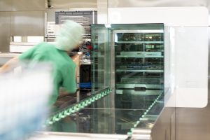 Die Reise der chirurgischen Instrumente in der AEMP nähert sich langsam dem Ende. Nach der Sterilisation unterliegen die Container und Päckchen wieder der Kontrolle eines Mitarbeitenden. Noch einmal wird jedes Set gescannt und freigegeben. 2018 haben die Mitarbeiterinnen und Mitarbeiter der AEMP insgesamt 121.000 Sets aufbereitet. Wobei ein Set aus bis zu 130 Einzel-Instrumenten bestehen kann.