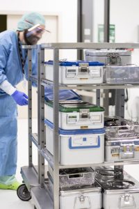 Die eigentliche Sterilisation der Instrumente findet im nächsten Schritt statt. Die sauberen OP-Instrumente, die nun in Containern mit Unter- und Überdruckventilen sowie in Vlies verpackt sind, werden erneut in eine Anlage geschoben, den Sterilisator. Dort wird aus den Containern und den Vlies-Paketen die Luft herausgezogen, damit der Dampf mit 134°C und zwei Bar Überdruck einströmen kann. Das sind die Bedingungen für die Sterilisation. Der Vorgang dauert insgesamt rund eineinhalb Stunden. „Die eigentliche Sterilisation ist nur fünf Minuten lang“, berichtet Schindler.Übrigens steht eine Maschine zusätzlich immer als Reserve für Notfälle bereit. Denn jedes OP-Set steht im Normalfall einmal täglich zur Verfügung. Die zusätzliche Anlage ermöglicht es, flexibler zu reagieren und den Sterilisationssprozess bei dringendem Bedarf ohne Wartezeit sofort zu starten.