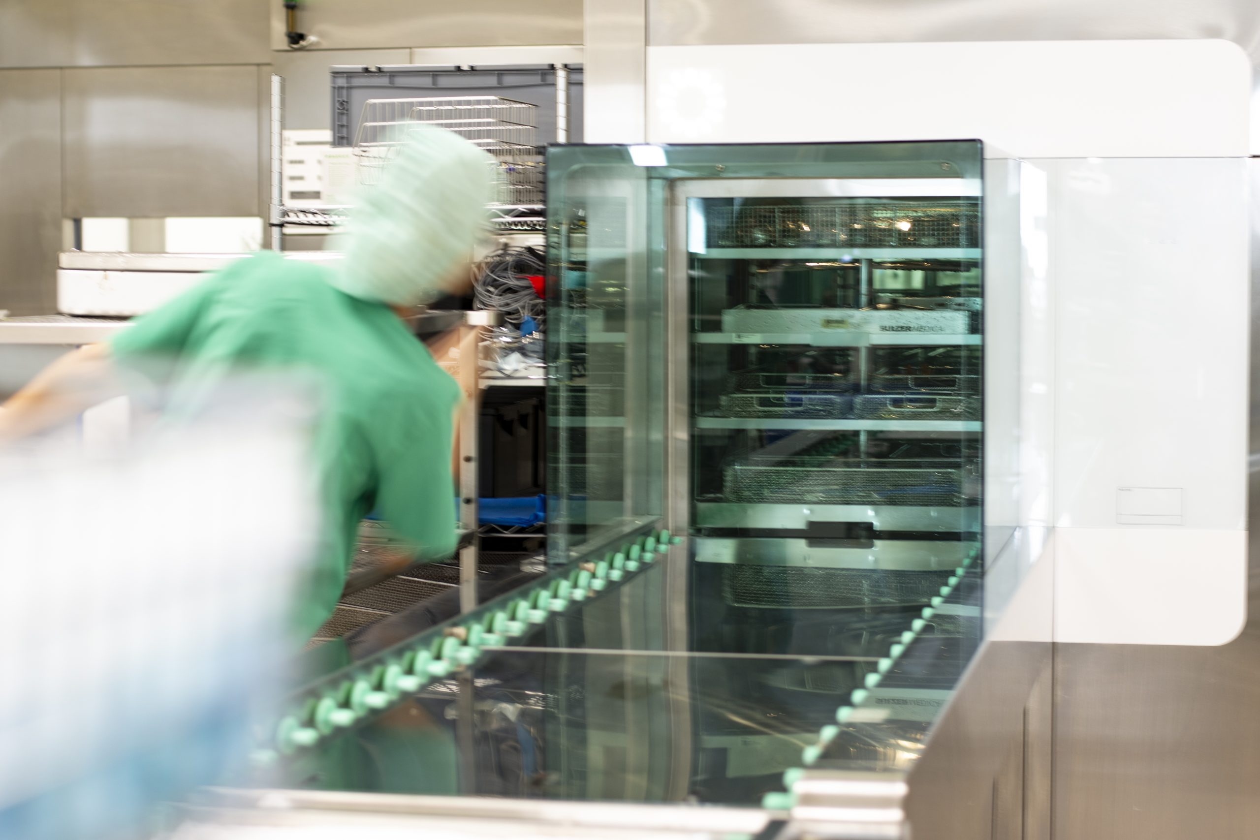 Die eigentliche Sterilisation der Instrumente findet im nächsten Schritt statt. Die sauberen OP-Instrumente, die nun in Containern mit Unter- und Überdruckventilen sowie in Vlies verpackt sind, werden erneut in eine Anlage geschoben, den Sterilisator. Dort wird aus den Containern und den Vlies-Paketen die Luft herausgezogen, damit der Dampf mit 134°C und zwei Bar Überdruck einströmen kann. Das sind die Bedingungen für die Sterilisation. Der Vorgang dauert insgesamt rund eineinhalb Stunden. „Die eigentliche Sterilisation ist nur fünf Minuten lang“, berichtet Schindler.Übrigens steht eine Maschine zusätzlich immer als Reserve für Notfälle bereit. Denn jedes OP-Set steht im Normalfall einmal täglich zur Verfügung. Die zusätzliche Anlage ermöglicht es, flexibler zu reagieren und den Sterilisationssprozess bei dringendem Bedarf ohne Wartezeit sofort zu starten.