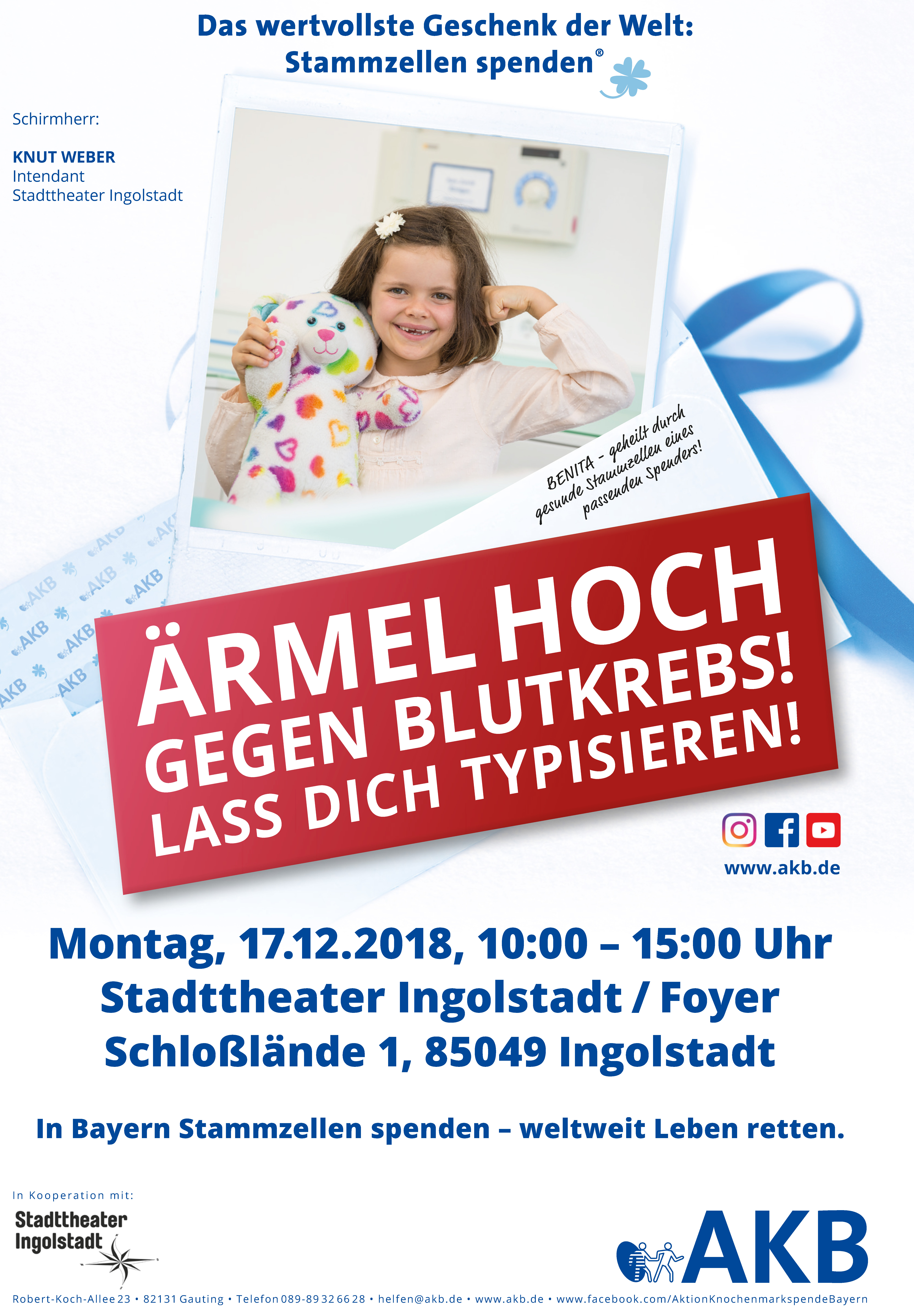 gern weisen wir an dieser Stelle auf eine wichtige Aktion des Stadttheaters Ingolstadt hin. Im Kampf gegen Leukämie lädt das Stadttheater am Montag, 17. Dezember 2018 von 10.0 bis 15.00 Uhr dazu ein, sich als Stammzellspender registrieren zu lassen.