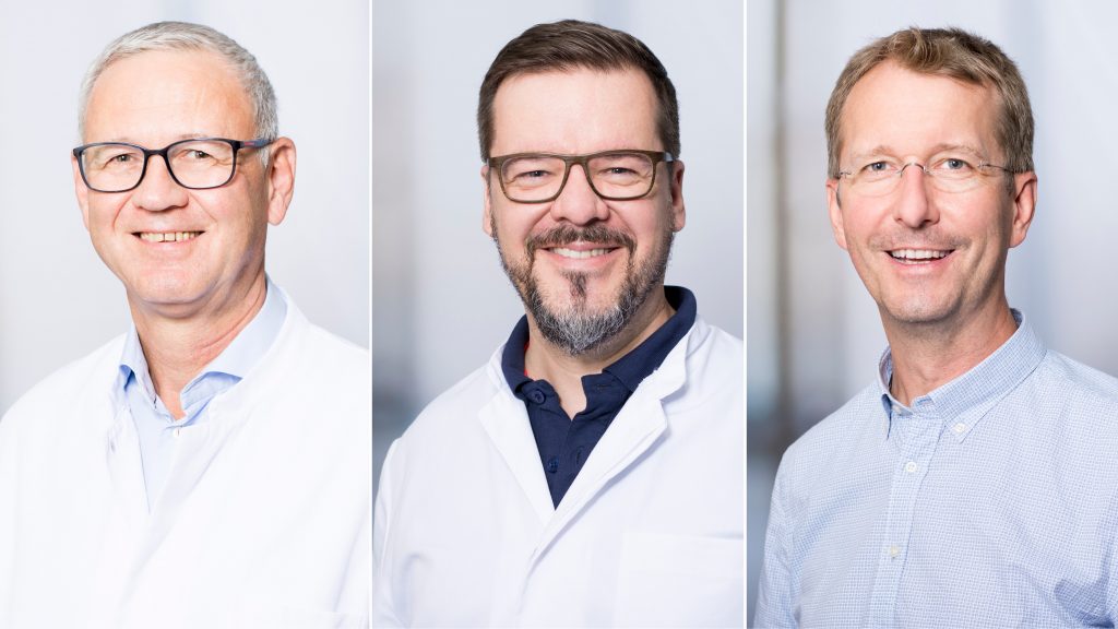 Bei der Versorgung der Opfer von Fahrradunfällen sehen die drei Mediziner Prof. Michael Wenzl, Dr. Robert Morrison und Dr. Micha Bahr regelmäßig, wie der Helm vor schweren Kopfverletzungen schützt. Prof. Dr. Michael Wenzl behandelt mit seinen Kolleginnen und Kollegen in der Unfallchirurgie jedes Jahr 40 bis 50 substantielle Schädelhirntraumen nach Fahrradunfällen. Sie werden substantiell genannt, weil nach einer solchen Verletzung mit Blutungen im Gehirnbereich meist dauerhaft Einschränkungen für den Betroffenen zurückbleiben. „Stürzt ein Fahrradfahrer mit Helm, dann hat er gute Chancen, mit nur einem leichten Schädelhirntrauma ohne bleibende Schäden davonzukommen. Der Helm mindert die kinetische Energie, die auf seinen Kopf einwirkt, um etwa 80 Prozent“, erklärt Prof. Dr. Michael Wenzl, der das Zentrum für Orthopädie und Unfallchirurgie am Klinikum leitet.