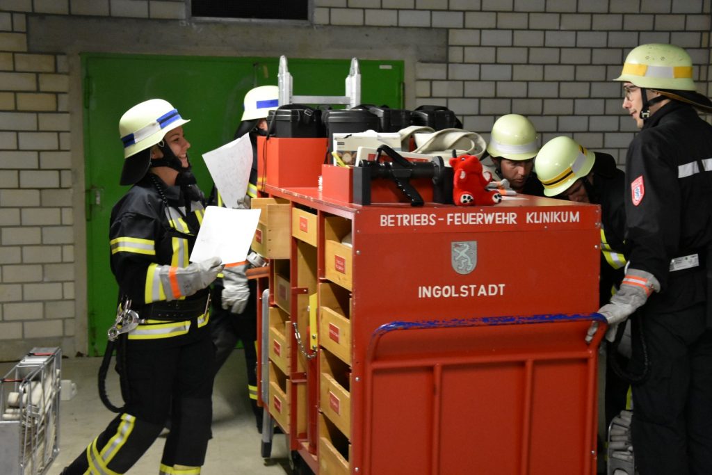 Anfang November fand nun eine zweiwöchige Schulung bei der Berufsfeuerwehr Ingolstadt statt. „Als Neue haben wir alle Grundlagen für den Einsatz als Betriebsfeuerwehrler gelernt: Kommandos verstehen und geben, Schläuche ausrollen und anschließen, funken,“ beschreibt Fabian Beck die Inhalte. Betriebsfeuerwehrler erhalten zudem eine Atemschutzgeräteträger Ausbildung. Hier werden zuerst die Grundlagen vom Tragen der Maske, des Lungenautomats und der Sauerstoffflasche erklärt. Zudem müssen angehenden Feuerwehrler mit der gesamten Ausrüstung einen Parcours bewältigen – bei Helligkeit und im Dunklen. Höhepunkt der 14-tägigen Ausbildung waren an den letzten beiden Schulungstagen die realitätsnahen Übungen im Klinikum. Unter anderem wurde im Keller ein Brandherd simuliert.