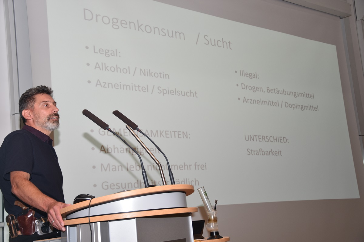 Zum Thema „Drogen und die Folgen“ hatte er mit Kriminaloberkommissar Ralf Münzner von der Polizei Ingolstadt einen Experten eingeladen. Auch er berichtete sehr anschaulich aus seinem Alltag und warnte davor, die Wirkungen von scheinbar harmlosen Drogen wie Alkohol und Cannabis zu unterschätzen. „Viele regen sich auf, wenn sie lesen, die Polizei hat einen Kiffer aufgehalten und an der Weiterfahrt gehindert, weil sie es für übertrieben halten. Aber betrachtet es mal aus der Sicht der Verwandten und Freunde, die einen geliebten Menschen verloren haben, weil ein Fahrer unter Drogeneinfluss die Kontrolle über sein Fahrzeug verloren hat und es so zu einem schlimmen Unfall kommt. Das ist übrigens nicht nur für die Angehörigen des Unfallopfers unendlich schlimm. Auch der Unfallverursacher wird sein Leben lang damit zu kämpfen haben“, machte Münzner eindrücklich deutlich.