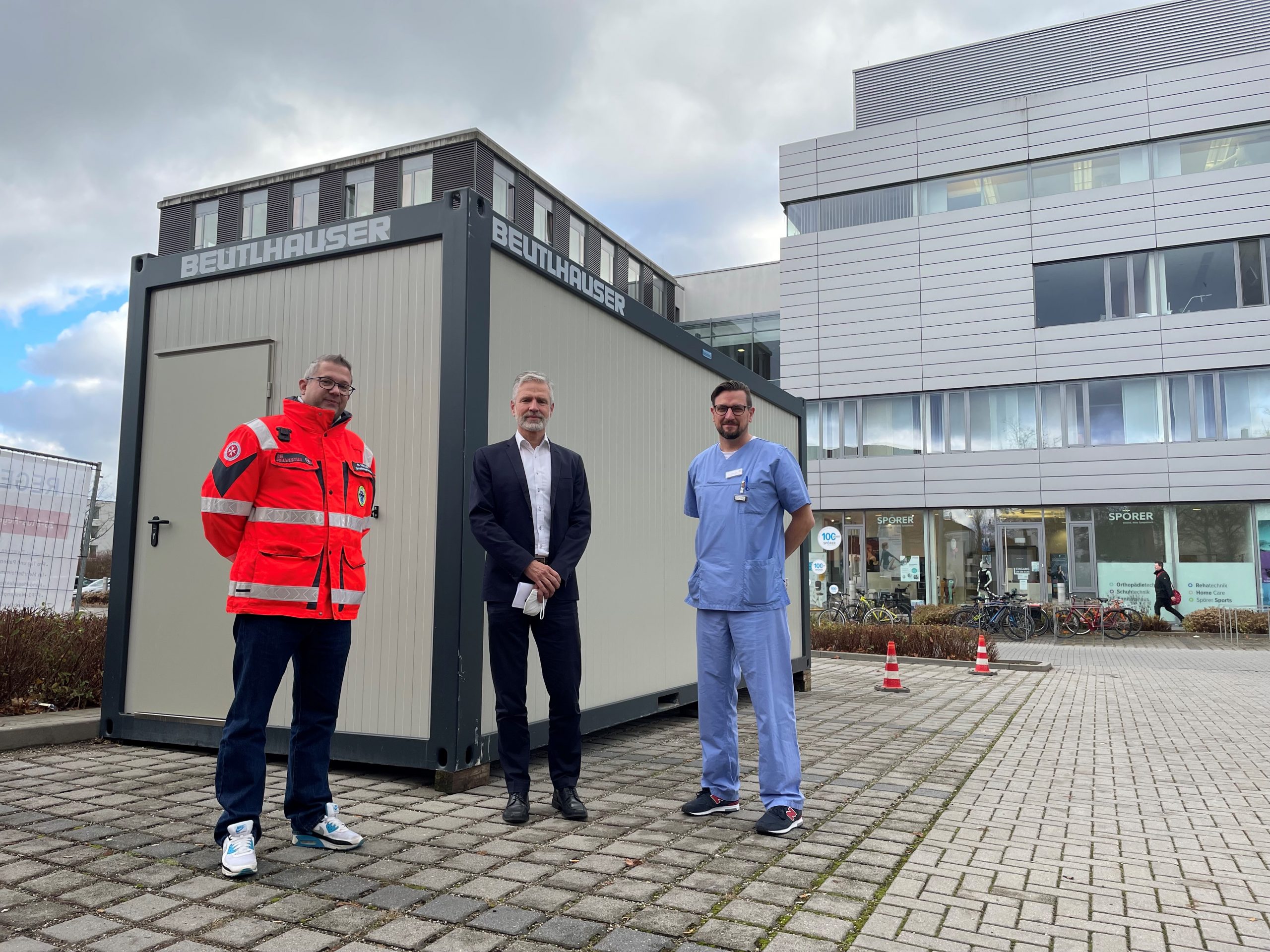 Sven Müller, Dr. Andreas Tiete und Dr. Stephan Steger (v.l) vor dem neuen Testzentrum am Ärztehaus.