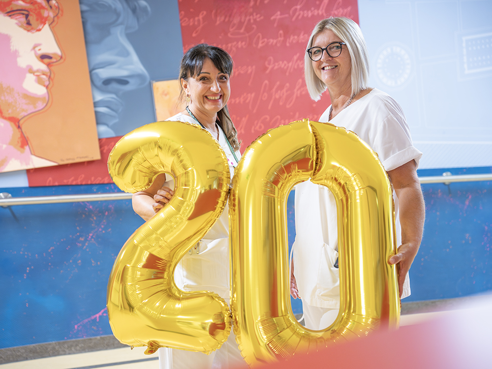 Wenn Katharina Adrian auf die vergangenen zwanzig Jahre zurückblickt, hat sie ein Lächeln im Gesicht: „Es hat sich seit damals schon einiges getan. Die Pflege wurde professioneller, die Arbeit digitaler und die Patient*innen“, sie überlegt kurz, „auch etwas anspruchsvoller als früher.“ Personell ist die Station genauso ausgestattet wie die anderen Stationen: „Der Personalschlüssel ist auf allen somatischen Stationen gleich – und in jedem Bereich haben wir hochqualifizierte Mitarbeiter*innen“ , ergänzt Jochen Bocklet, Geschäftsführer Finanzen und Infrastruktur, Personal und Berufsbildungszentrum Gesundheit.