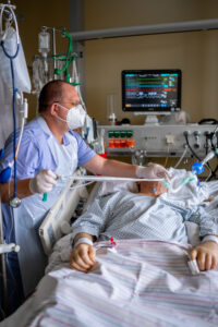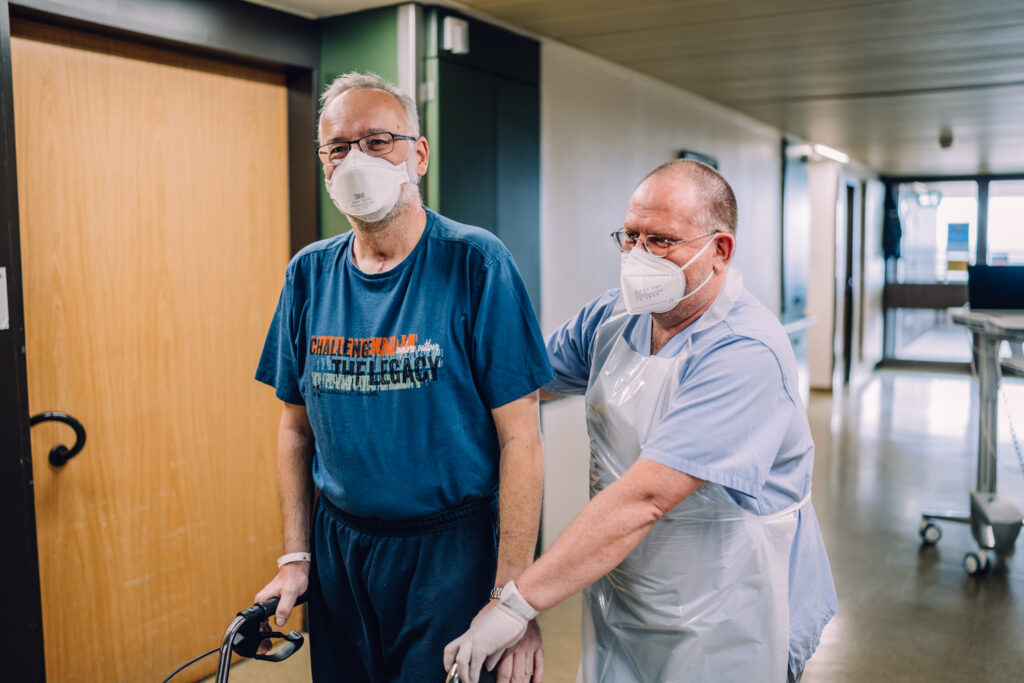 Einmal habe er wahrgenommen, dass seine Frau ihn besucht hat. „Das spürt man einfach“, sagt er. „Und der Tom, der war auch sehr präsent in meiner Wahrnehmung.“ Mit „Tom“ ist Thomas Kemmetter gemeint, der seit Tag eins fast täglich beim Patienten war, um die Atmung zu kontrollieren und die Maschinen richtig einzustellen. „Denn genauso wichtig wie die künstliche Beatmung ist auch die schrittweise Entwöhnung von der Beatmung“, erklärt der langjährige Intensivpfleger und Atmungstherapeut. Das sogenannte „Weaning“ beginnt bereits mit der Intubation und wird Schritt für Schritt ausgeweitet.