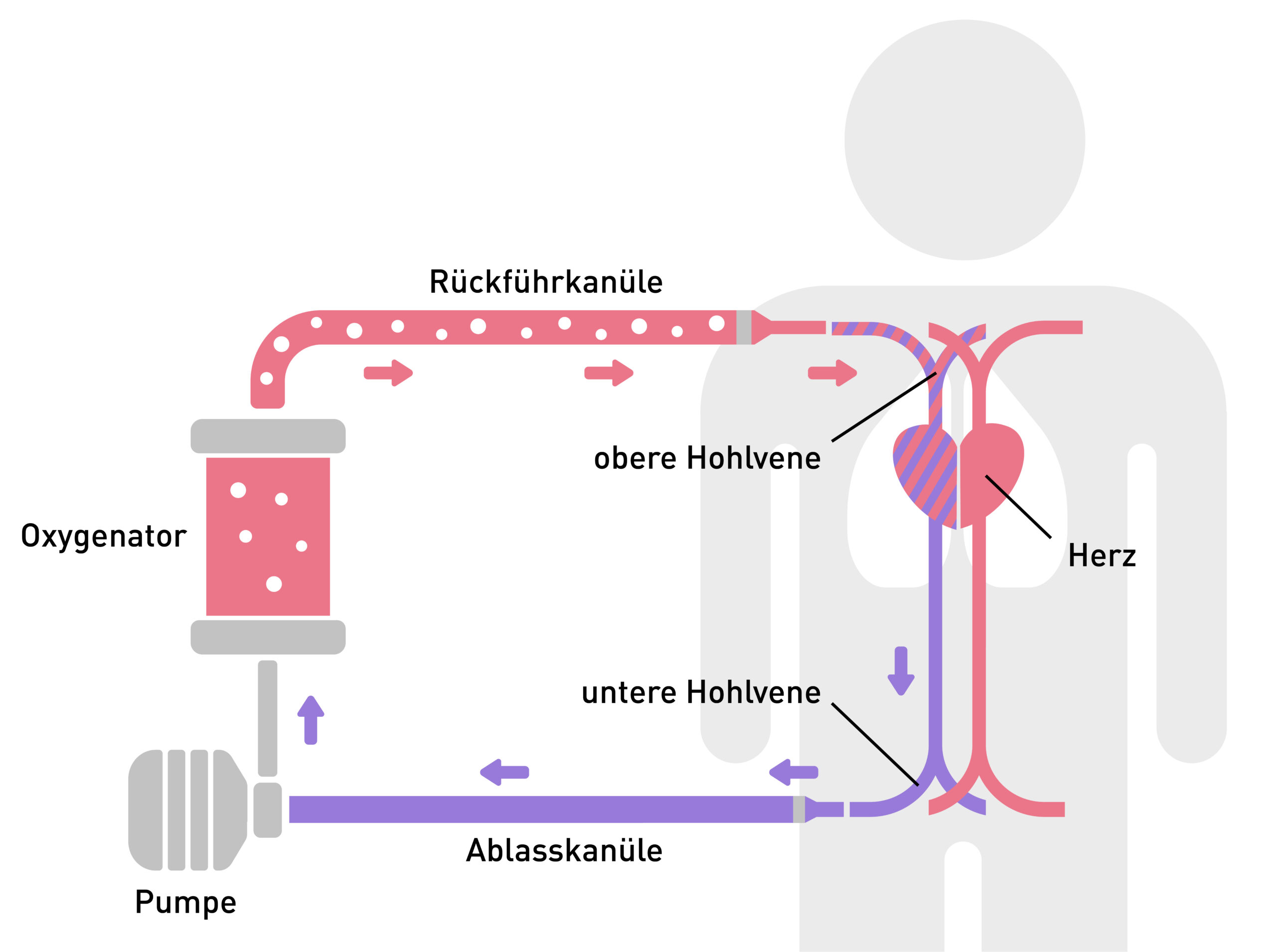 Auch unter der künstlichen Beatmung entwickelte sich keine ausreichende Verbesserung der Lungenfunktion, so dass wir uns recht zügig dazu entschlossen, die Lunge komplett zu entlasten und sie an die künstliche Lunge, die ECMO-Maschine, anzuschließen. Die extrakorporale Membranoxygenierung ist ein etabliertes System, welches seit vielen Jahren erfolgreich bei Lungenversagen eingesetzt wird. Seit der Corona-Pandemie ist die „ECMO“ sehr bekannt. Das Blut wird mittels steriler Schlauchsysteme aus dem Körper ausgeleitet und über eine Membran außerhalb des Körpers mit Sauerstoff angereichert. Dann geht das Blut zurück in das menschliche Gefäßsystem.